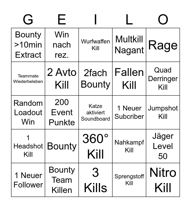 This bingo card has 25 words: Bounty, 3 Kills, 2fach Bounty, 1 Neuer Follower, Rage, Bounty >10min Extract, Teammate Wiederbeleben, Win nach rez., 1 Neuer Subcriber, 360° Kill, Fallen Kill, Random Loadout Win, Nahkampf Kill, Jäger Level 50, 2 Avto Kill, Nitro Kill, Jumpshot Kill, Wurfwaffen Kill, Quad Derringer Kill, 200 Event Punkte, Katze aktiviert Soundboard, Bounty Team Killen, 1 Headshot Kill, Multkill Nagant and Sprengstoff Kill.