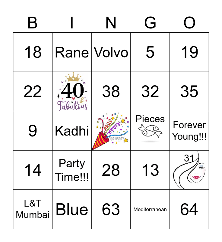 This bingo card has 13 images, a free space and 63 words: 26, 12, AMRITA!!!, 31, 60, 6, Rane, 1985, 38, 20, 28, 3 Idiots, Forever Young!!!, 19, 25, 22, Kadhi, 18, Indore, 32, Party Time!!!, 14, 5, 34, 16, 1, 27, 37, 24, 59, 29, March, SGITS, 4, 35, L&T Mumbai, 57, Mediterranean, 2, 9, Pieces, 43, 62, 45, 64, Blue, Aquamarine, 13, Green, Greece, 2010, 63, Fashionista, Naughty!!!, Spicy!!!, Volvo, 58, 30, 41, 47, 50, Allentown PA and 61.
