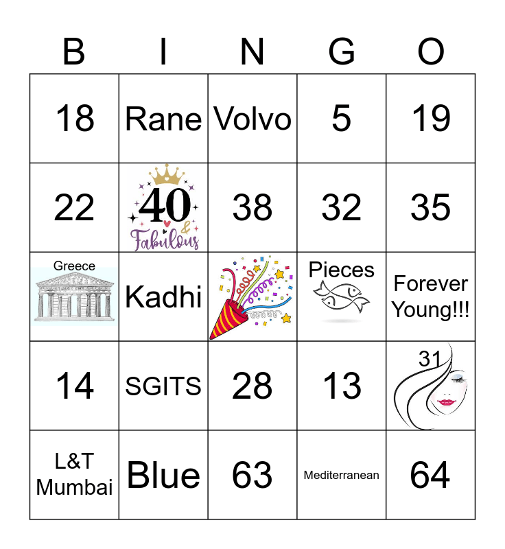 This bingo card has 13 images, a free space and 63 words: 26, 12, AMRITA!!!, 31, 60, Party Time!!!, Rane, 1985, 38, 20, 28, 3 Idiots, Forever Young!!!, 19, 25, 22, Kadhi, 18, Indore, 32, SGITS, 14, 5, 1, 16, 34, 27, 37, 24, 59, 29, 62, 6, 4, 35, L&T Mumbai, 57, Mediterranean, 41, Greece, Pieces, 43, 61, 45, 64, Blue, Aquamarine, 13, Green, 9, 2010, 63, Fashionista, Naughty!!!, Spicy!!!, Volvo, 58, 30, 2, 47, 50, Allentown PA and March.