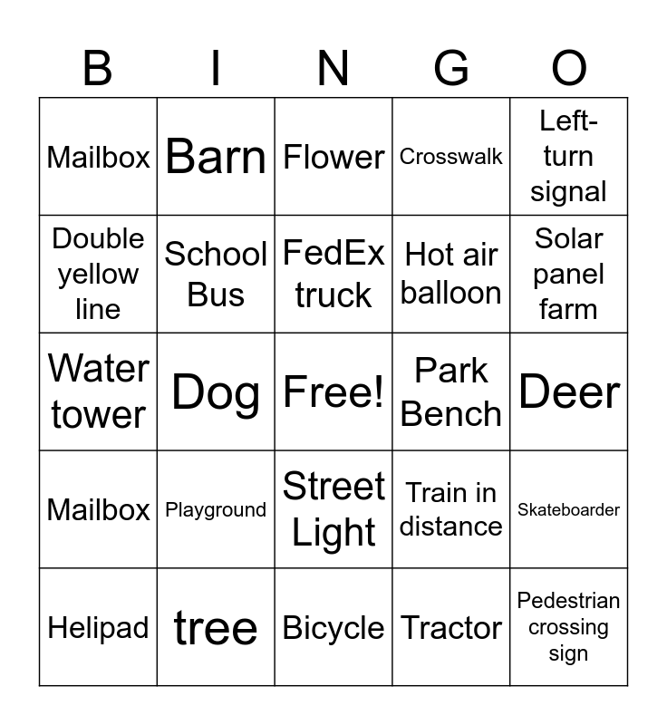 This bingo card has a free space and 30 words: tree, Red Car, Dog, Stop Sign, Mailbox, Flower, School Bus, Street Light, Park Bench, Bicycle, Deer, Pedestrian crossing sign, Tractor, Ice cream truck, Solar panel farm, Fountain, Train in distance, Mailbox, Playground, Left-turn signal, Water tower, School zone sign, Barn, Hot air balloon, Double yellow line, Crosswalk, Skateboarder, Helipad, FedEx truck and Garbage truck.