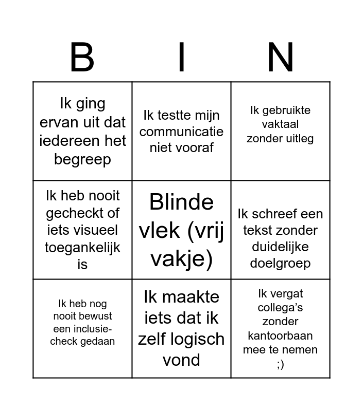 This bingo card has a free space and 8 words: Ik schreef een tekst zonder duidelijke doelgroep, Ik gebruikte vaktaal zonder uitleg, Ik testte mijn communicatie niet vooraf, Ik heb nog nooit bewust een inclusie-check gedaan, Ik ging ervan uit dat iedereen het begreep, Ik vergat collega’s zonder kantoorbaan mee te nemen ;), Ik heb nooit gecheckt of iets visueel toegankelijk is and Ik maakte iets dat ik zelf logisch vond.