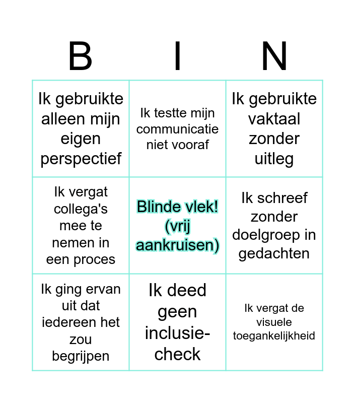 This bingo card has a free space and 8 words: Ik schreef zonder doelgroep in gedachten, Ik gebruikte vaktaal zonder uitleg, Ik testte mijn communicatie niet vooraf, Ik ging ervan uit dat iedereen het zou begrijpen, Ik gebruikte alleen mijn eigen perspectief, Ik vergat de visuele toegankelijkheid, Ik vergat collega's mee te nemen in een proces and Ik deed geen inclusie-check.