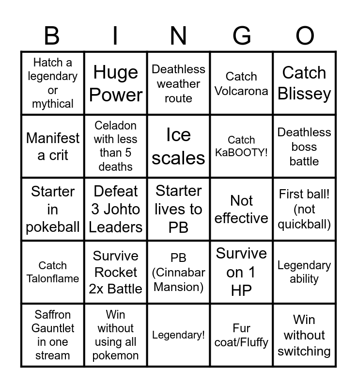 This bingo card has 25 words: Catch Talonflame, Win without using all pokemon, Starter lives to PB, Fur coat/Fluffy, Catch Blissey, Hatch a legendary or mythical, Huge Power, Deathless weather route, Not effective, Legendary ability, Manifest a crit, Celadon with less than 5 deaths, Legendary!, Survive on 1 HP, Deathless boss battle, Saffron Gauntlet in one stream, Defeat 3 Johto Leaders, Ice scales, Catch KaBOOTY!, First ball! (not quickball), Starter in pokeball, Survive Rocket 2x Battle, PB (Cinnabar Mansion), Catch Volcarona and Win without switching.