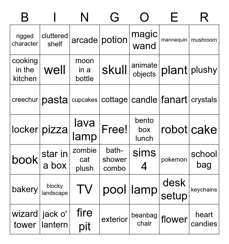 This bingo card has a free space and 48 words: lamp, plant, exterior, pizza, cupcakes, cake, cluttered shelf, jack o' lantern, mannequin, bath-shower combo, mushroom, potion, fanart, candle, bakery, robot, cooking in the kitchen, plushy, desk setup, magic wand, animate objects, lava lamp, rigged character, well, keychains, moon in a bottle, crystals, wizard tower, cottage, pasta, flower, bento box lunch, school bag, blocky landscape, locker, sims 4, pokemon, creechur, zombie cat plush, TV, book, heart candies, arcade, fire pit, skull, pool, star in a box and beanbag chair.