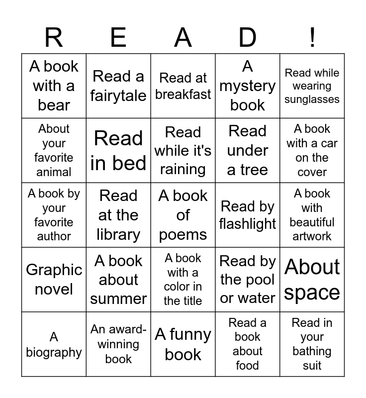 This bingo card has 25 words: A book about summer, A funny book, Read while it's raining, A biography, Read while wearing sunglasses, A book with a bear, About your favorite animal, Read a fairytale, Read by flashlight, A book with a color in the title, Read under a tree, A book by your favorite author, Read by the pool or water, About space, Read in bed, Read in your bathing suit, A book with beautiful artwork, Read at breakfast, A book with a car on the cover, Read at the library, A book of poems, An award-winning book, Graphic novel, A mystery book and Read a book about food.