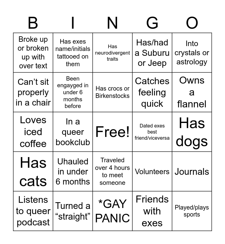 This bingo card has a free space and 24 words: Listens to queer podcast, Uhauled in under 6 months, Has crocs or Birkenstocks, Friends with exes, Into crystals or astrology, Broke up or broken up with over text, Has exes name/initials tattooed on them, Has neurodivergent traits, Dated exes best friend/viceversa, Has dogs, Loves iced coffee, Been engayged in under 6 months before, Volunteers, Journals, Can’t sit properly in a chair, Turned a “straight”, *GAY PANIC, Has/had a Suburu or Jeep, Owns a flannel, Has cats, In a queer bookclub, Traveled over 4 hours to meet someone, Catches feeling quick and Played/plays sports.