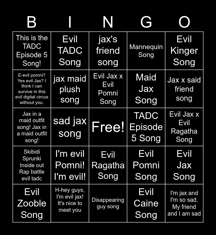 This bingo card has a free space and 24 words: I'm evil Pomni! I'm evil!, H-hey guys, I'm evil jax! It's nice to meet you, Evil Jax x Evil Pomni Song, Evil Zooble Song, Evil Kinger Song, This is the TADC Episode 5 Song!, E-evil pomni? Yes evil Jax? I think I can survive in this evil digital circus without you., Evil TADC Song, TADC Episode 5 Song, Evil Ragatha Song, Maid Jax Song, Jax in a maid outfit song! Jax in a maid outfit song!, Evil Pomni Song, Evil Jax Song, jax maid plush song, Evil Caine Song, Evil Jax x Evil Ragatha Song, jax's friend song, Jax x said friend song, sad jax song, I'm jax and I'm so sad. My friend and I am sad, Skibidi Sprunki Inside out Rap battle evil tadc, Mannequin Song and Disappearing guy song.