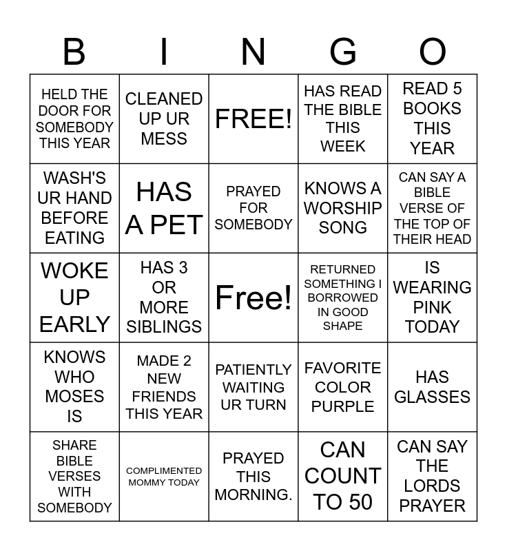 This bingo card has a free space and 24 words: MADE 2 NEW FRIENDS THIS YEAR, COMPLIMENTED MOMMY TODAY, PRAYED FOR SOMEBODY, SHARE BIBLE VERSES WITH SOMEBODY, READ 5 BOOKS THIS YEAR, HELD THE DOOR FOR SOMEBODY THIS YEAR, WASH'S UR HAND BEFORE EATING, CLEANED UP UR MESS, RETURNED SOMETHING I BORROWED IN GOOD SHAPE, PATIENTLY WAITING UR TURN, KNOWS A WORSHIP SONG, WOKE UP EARLY, FAVORITE COLOR PURPLE, HAS GLASSES, HAS A PET, CAN COUNT TO 50, IS WEARING PINK TODAY, FREE!, CAN SAY A BIBLE VERSE OF THE TOP OF THEIR HEAD, HAS 3 OR MORE SIBLINGS, CAN SAY THE LORDS PRAYER, KNOWS WHO MOSES IS, HAS READ THE BIBLE THIS WEEK and PRAYED THIS MORNING..