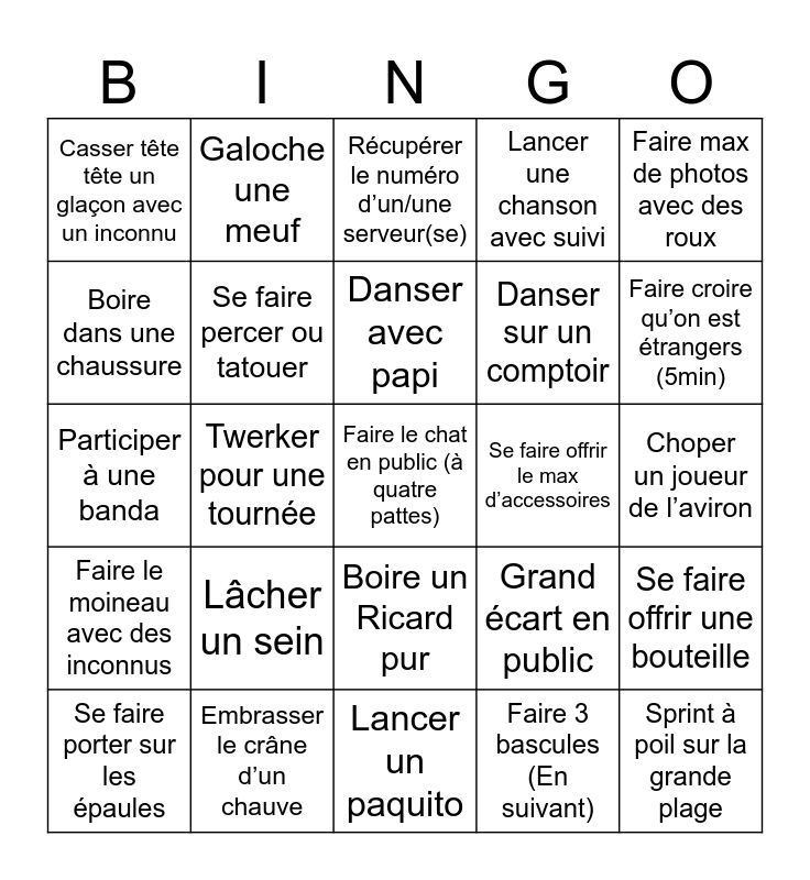 This bingo card has a free space and 24 words: Lâcher un sein, Embrasser le crâne d’un chauve, Danser avec papi, Se faire porter sur les épaules, Faire max de photos avec des roux, Casser tête tête un glaçon avec un inconnu, Boire dans une chaussure, Galoche une meuf, Se faire offrir le max d’accessoires, Boire un Ricard pur, Danser sur un comptoir, Participer à une banda, Grand écart en public, Se faire offrir une bouteille, Se faire percer ou tatouer, Faire 3 bascules (En suivant), Choper un joueur de l’aviron, Récupérer le numéro d’un/une serveur(se), Faire croire qu’on est étrangers (5min), Twerker pour une tournée, Sprint à poil sur la grande plage, Faire le moineau avec des inconnus, Lancer une chanson avec suivi and Lancer un paquito.