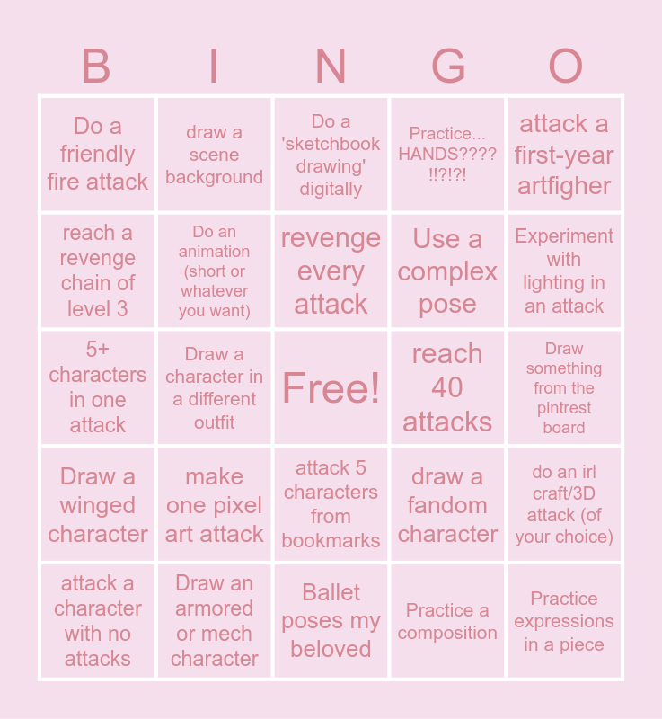 This bingo card has a free space and 24 words: make one pixel art attack, Draw an armored or mech character, revenge every attack, attack a character with no attacks, attack a first-year artfigher, Do a friendly fire attack, reach a revenge chain of level 3, draw a scene background, reach 40 attacks, attack 5 characters from bookmarks, Use a complex pose, 5+ characters in one attack, draw a fandom character, do an irl craft/3D attack (of your choice), Do an animation (short or whatever you want), Practice a composition, Draw something from the pintrest board, Do a 'sketchbook drawing' digitally, Experiment with lighting in an attack, Draw a character in a different outfit, Practice expressions in a piece, Draw a winged character, Practice... HANDS???? !!?!?! and Ballet poses my beloved.