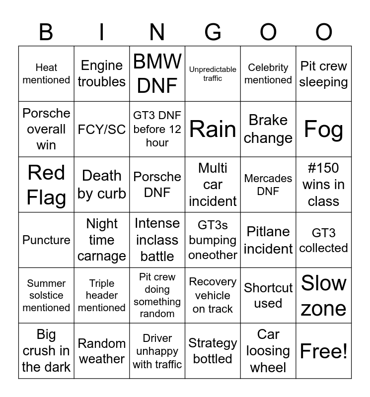 This bingo card has 42 words: Car loosing wheel, FCY/SC, Dacia Mentioned, Mercades DNF, GT3 collected, Night time carnage, Red Flag, Fog, BMW DNF, #150 wins in class, Porsche DNF, Rain, Fog, Celebrity mentioned, Random weather, Puncture, Slow zone, Brake change, Free!, Engine troubles, Pit crew sleeping, Pit crew doing something random, Summer solstice mentioned, Heat mentioned, Car with one headlight, Big crush in the dark, GT3 DNF before 12 hour, Favourite out after 12 Hours, Triple header mentioned, Shortcut used, Fans causing carnage, Multi car incident, Porsche overall win, Pitlane incident, Driver unhappy with traffic, Intense inclass battle, GT3s bumping oneother, Death by curb, Recovery vehicle on track, Strategy bottled, Unpredictable traffic and Fuel system mentioned.