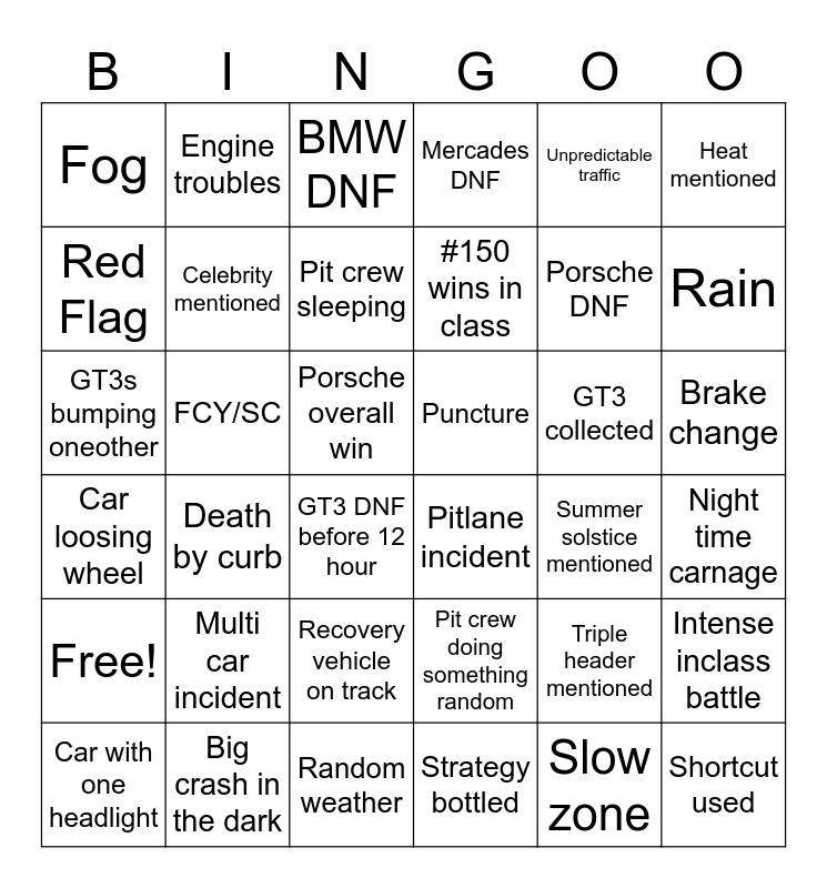 This bingo card has 42 words: Car loosing wheel, FCY/SC, Dacia Mentioned, Mercades DNF, GT3 collected, Night time carnage, Red Flag, BBQ spotted, BMW DNF, #150 wins in class, Porsche DNF, Rain, Fog, Celebrity mentioned, Random weather, Puncture, Slow zone, Brake change, Free!, Engine troubles, Pit crew sleeping, Pit crew doing something random, Summer solstice mentioned, Heat mentioned, Car with one headlight, Big crash in the dark, GT3 DNF before 12 hour, Favourite out after 12 Hours, Triple header mentioned, Shortcut used, Fans causing carnage, Multi car incident, Porsche overall win, Pitlane incident, Driver unhappy with traffic, Intense inclass battle, GT3s bumping oneother, Death by curb, Recovery vehicle on track, Strategy bottled, Unpredictable traffic and Fuel system mentioned.