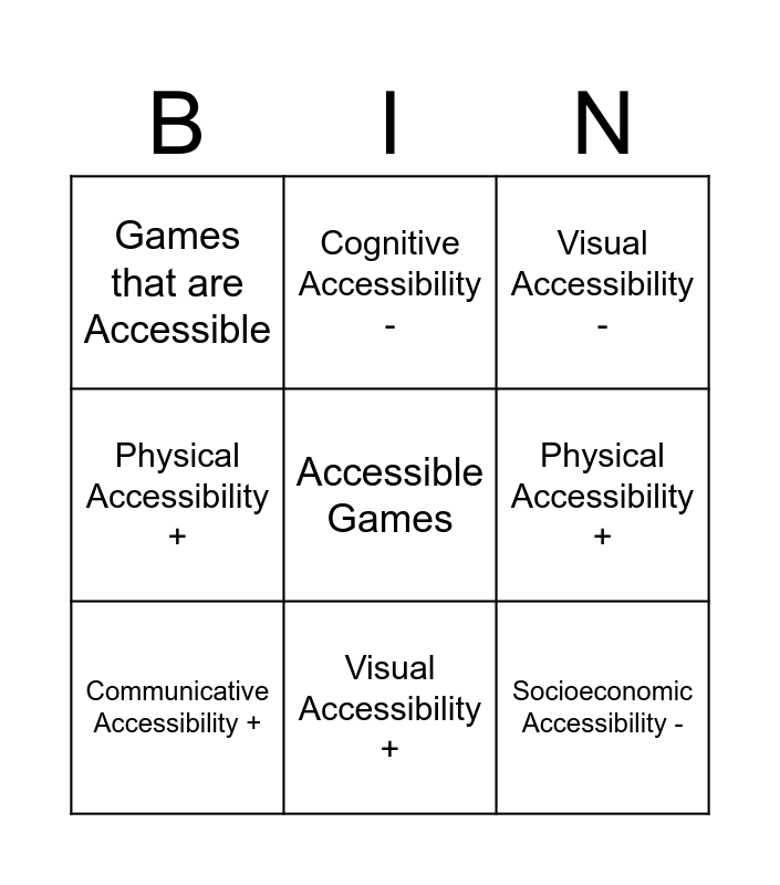 This bingo card has a free space and 8 words: Physical Accessibility +, Visual Accessibility -, Cognitive Accessibility -, Communicative Accessibility +, Games that are Accessible, Socioeconomic Accessibility -, Physical Accessibility + and Visual Accessibility +.