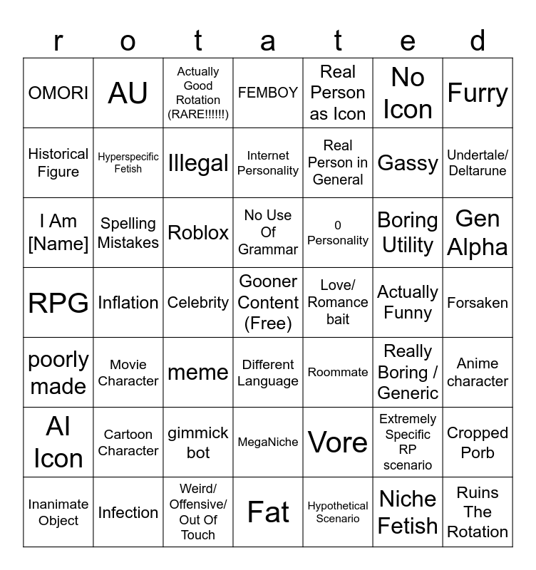 This bingo card has a free space and 48 words: Vore, Gassy, Fat, Inflation, Roblox, Forsaken, AU, Infection, No Icon, Different Language, Furry, FEMBOY, Boring Utility, 0 Personality, AI Icon, Actually Funny, Historical Figure, Undertale/ Deltarune, Extremely Specific RP scenario, Real Person as Icon, Real Person in General, Celebrity, OMORI, Hyperspecific Fetish, Cropped Porb, Illegal, Gen Alpha, Inanimate Object, No Use Of Grammar, Spelling Mistakes, Niche Fetish, Love/ Romance bait, Anime character, Cartoon Character, RPG, Roommate, Really Boring / Generic, I Am [Name], meme, gimmick bot, poorly made, Ruins The Rotation, Actually Good Rotation (RARE!!!!!!), Weird/ Offensive/ Out Of Touch, Internet Personality, MegaNiche, Movie Character and Hypothetical Scenario.