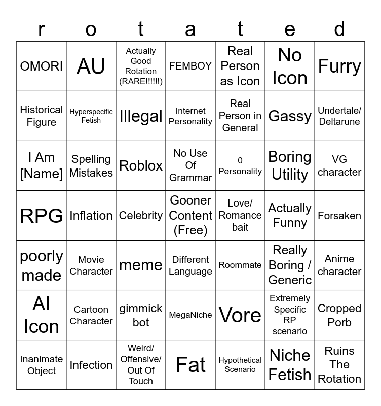 This bingo card has a free space and 48 words: Vore, Gassy, Fat, Inflation, Roblox, Forsaken, AU, Infection, No Icon, Different Language, Furry, FEMBOY, Boring Utility, 0 Personality, AI Icon, Actually Funny, Historical Figure, Undertale/ Deltarune, Extremely Specific RP scenario, Real Person as Icon, Real Person in General, Celebrity, OMORI, Hyperspecific Fetish, Cropped Porb, Illegal, VG character, Inanimate Object, No Use Of Grammar, Spelling Mistakes, Niche Fetish, Love/ Romance bait, Anime character, Cartoon Character, RPG, Roommate, Really Boring / Generic, I Am [Name], meme, gimmick bot, poorly made, Ruins The Rotation, Actually Good Rotation (RARE!!!!!!), Weird/ Offensive/ Out Of Touch, Internet Personality, MegaNiche, Movie Character and Hypothetical Scenario.