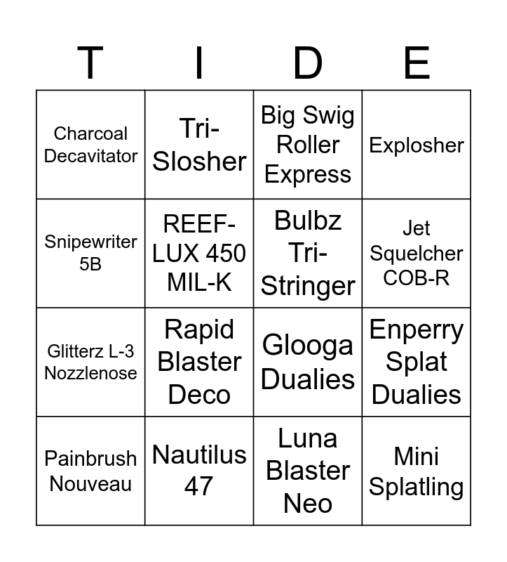 This bingo card has 45 words: Flingza Roller, Painbrush Nouveau, Goo Tuber, REEF-LUX 450, Splatana Wiper Deco, Custom Jet Squelcher, Big Swig Roller Express, Octobrush Nouveau, Snipewriter 5B, Bloblobber, Explosher, Nautilus 47, Aerospray RG, Forge Splattershot Pro, S-BLAST '91, Sloshing Machine, Hydra Splatling, Glooga Dualies, Annaki Splattershot Nova, Rapid Blaster Deco, Tri-Slosher, Ballpoint Splatling, Sorella Brella, Charcoal Decavitator, Sploosh-o-matic, Luna Blaster Neo, L-3 Nozzlenose D, Inkbrush Nouveau, Custom Goo Tuber, Mini Splatling, Wellstring V, Splatana Wiper, Custom Blaster, Custom Explosher, Nautilus 79, Enperry Splat Dualies, Recycled Brella 24 Mk II, Splash-o-matic GCK-O, Splattershot Pro FRZ-N, Jet Squelcher COB-R, REEF-LUX 450 MIL-K, Glitterz L-3 Nozzlenose, Planetz Big Swig Roller, Bulbz Tri-Stringer and Stickerz Splatana Stamper.