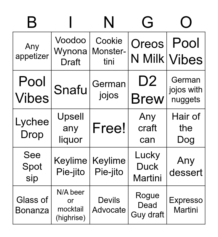 This bingo card has a free space and 24 words: Glass of Bonanza, Keylime Pie-jito, German jojos, Rogue Dead Guy draft, Pool Vibes, Any appetizer, Voodoo Wynona Draft, Cookie Monster-tini, Any craft can, Hair of the Dog, Lychee Drop, Snafu, Lucky Duck Martini, Any dessert, Pool Vibes, N/A beer or mocktail (highrise), Devils Advocate, Oreos N Milk, German jojos with nuggets, See Spot sip, Upsell any liquor, Keylime Pie-jito, D2 Brew and Expresso Martini.
