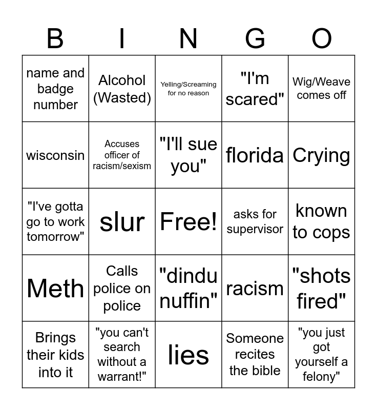 This bingo card has a free space and 34 words: Police bodycam bingo, Someone recites the bible, "I can't breathe" (Free Space), "I'm not resisting!" Resists, Meth, Accuses officer of racism/sexism, Wig/Weave comes off, Brings their kids into it, Alcohol (Wasted), Sovcit, "I'll sue you", Yelling/Screaming for no reason, “the cuffs are too tight”, fakes medical emergency, asks for supervisor, Crying, "you can't search without a warrant!", "I've gotta go to work tomorrow", Calls police on police, racism, "dindu nuffin", saying "bruh/bro", name and badge number, known to cops, lies, "you just got yourself a felony", "I'm scared", taser/less-than-lethal deployed, florida, wisconsin, "i know my rights", slur, "shots fired" and probation/warrant.
