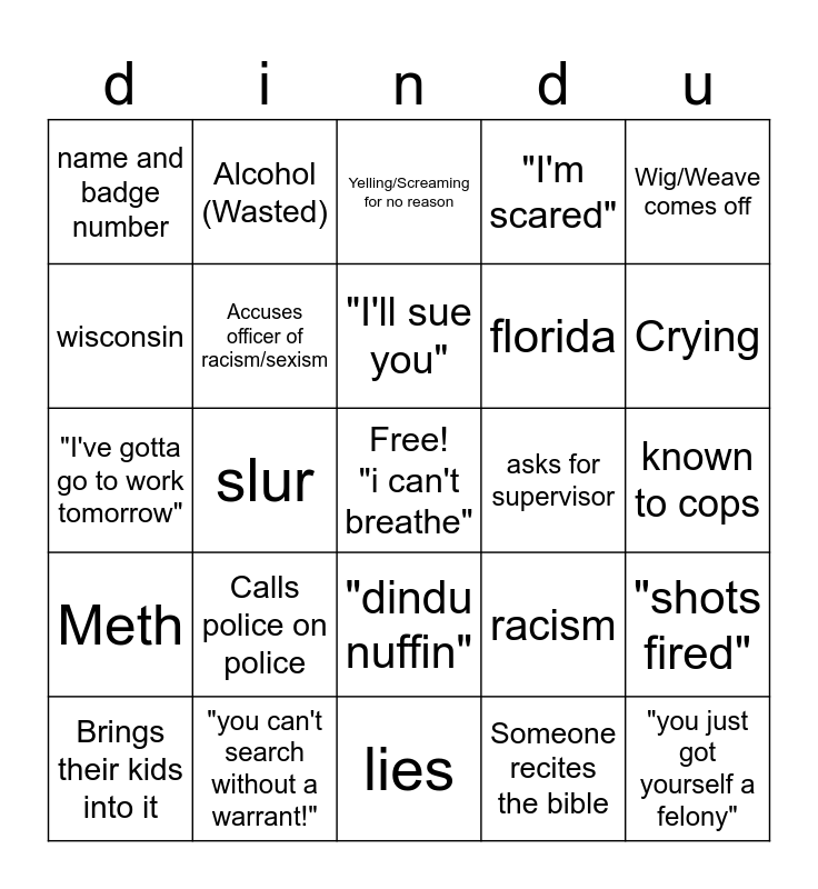 This bingo card has a free space and 34 words: Police bodycam bingo, Someone recites the bible, "I can't breathe" (Free Space), "I'm not resisting!" Resists, Meth, Accuses officer of racism/sexism, Wig/Weave comes off, Brings their kids into it, Alcohol (Wasted), Sovcit, "I'll sue you", Yelling/Screaming for no reason, “the cuffs are too tight”, fakes medical emergency, asks for supervisor, Crying, "you can't search without a warrant!", "I've gotta go to work tomorrow", Calls police on police, racism, "dindu nuffin", saying "bruh/bro", name and badge number, known to cops, lies, "you just got yourself a felony", "I'm scared", taser/less-than-lethal deployed, florida, wisconsin, "i know my rights", slur, "shots fired" and probation/warrant.