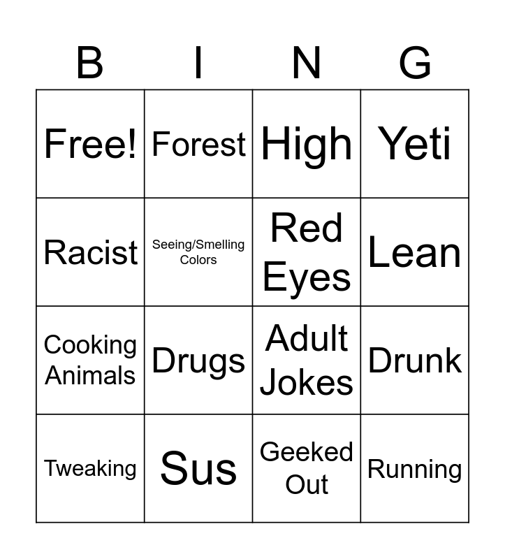 This bingo card has 21 words: Cooking Animals, Booger Sugar/Goblin Dust, Red Eyes, Running, Tweaking, Forest, High, Yeti, Free!, Seeing/Smelling Colors, Weed, Lean, Taco Bell, Sus, Geeked Out, Humans, Racist, Drugs, Adult Jokes, Drunk and Slang.