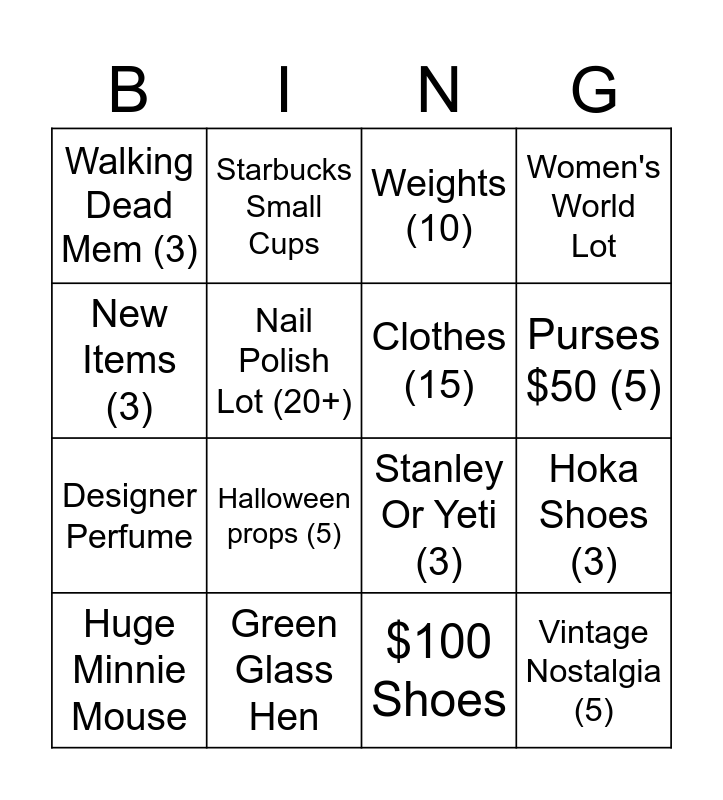 This bingo card has 16 words: Green Glass Hen, Hoka Shoes (3), Weights (10), Walking Dead Mem (3), Designer Perfume, Starbucks Small Cups, Stanley Or Yeti (3), $100 Shoes, New Items (3), Nail Polish Lot (20+), Huge Minnie Mouse, Women's World Lot, Halloween props (5), Purses $50 (5), Clothes (15) and Vintage Nostalgia (5).