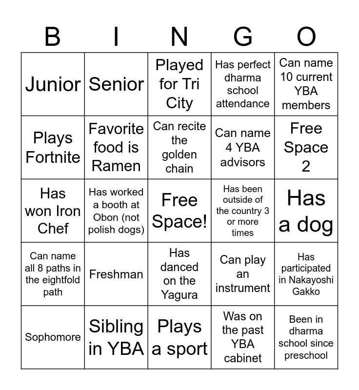 This bingo card has a free space and 24 words: Freshman, Sibling in YBA, Can recite the golden chain, Sophomore, Can name 10 current YBA members, Junior, Plays Fortnite, Senior, Has been outside of the country 3 or more times, Has danced on the Yagura, Can name 4 YBA advisors, Has won Iron Chef, Can play an instrument, Has participated in Nakayoshi Gakko, Favorite food is Ramen, Was on the past YBA cabinet, Has a dog, Played for Tri City, Free Space 2, Has worked a booth at Obon (not polish dogs), Been in dharma school since preschool, Can name all 8 paths in the eightfold path, Has perfect dharma school attendance and Plays a sport.