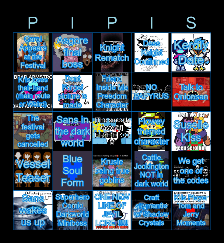 This bingo card has 24 images, a free space and 24 words: Sans wakes us up, Blue Soul Form, Friend Inside Me Freedom Character, Craft skymantle w/ Shadow Crystals, Kerdly Date, Carol Appears at the Festival, Asgore final boss, Knight Rematch, Flowey themed character, Suselle Kiss, The festival gets cancelled, Dont Forget picture is made, Cattie Jockington NOT in dark world, We get one of the codes, Kris loses their hand (main route or Weird), Superhero Comic Darkworld Miniboss, ONE NEW LINE OF JEVIL LORE ‼️‼️‼️, Dess Knight Confirmed, Talk to Onionsan, Vessel Teaser, Sans in the dark world, Krusie being true goblins, NO PAPYRUS and Kris Player Tom and Jerry Moments.