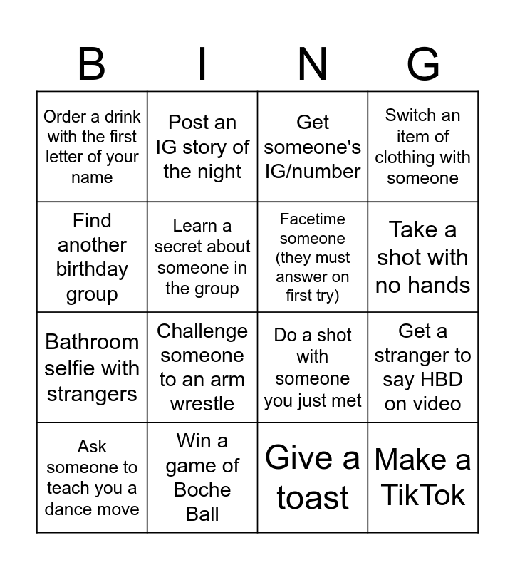 This bingo card has 16 words: Win a game of Boche Ball, Get a stranger to say HBD on video, Get someone's IG/number, Order a drink with the first letter of your name, Bathroom selfie with strangers, Post an IG story of the night, Do a shot with someone you just met, Give a toast, Find another birthday group, Learn a secret about someone in the group, Ask someone to teach you a dance move, Switch an item of clothing with someone, Challenge someone to an arm wrestle, Take a shot with no hands, Facetime someone (they must answer on first try) and Make a TikTok.