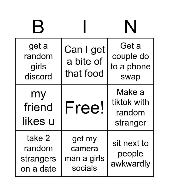 This bingo card has a free space and 8 words: Make a tiktok with random stranger, Get a couple do to a phone swap, Can I get a bite of that food, take 2 random strangers on a date, get a random girls discord, sit next to people awkwardly, my friend likes u and get my camera man a girls socials.