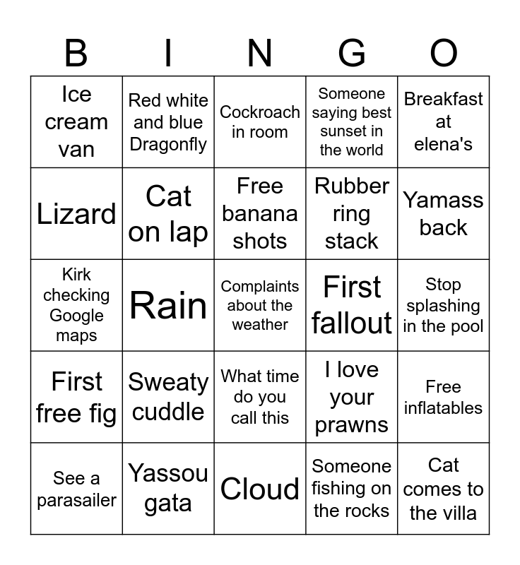 This bingo card has a free space and 24 words: Sweaty cuddle, Yassou gata, Free banana shots, See a parasailer, Breakfast at elena's, Ice cream van, Lizard, Red white and blue Dragonfly, First fallout, What time do you call this, Rubber ring stack, Kirk checking Google maps, I love your prawns, Free inflatables, Cat on lap, Someone fishing on the rocks, Stop splashing in the pool, Cockroach in room, Yamass back, Rain, Cat comes to the villa, First free fig, Someone saying best sunset in the world and Cloud.