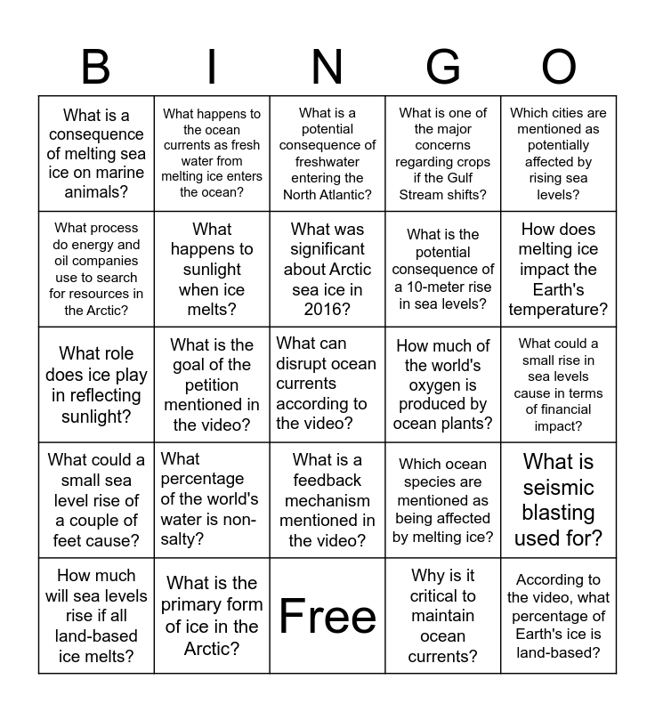 This bingo card has a free space and 24 words: What percentage of the world's water is non-salty?, What is the primary form of ice in the Arctic?, What was significant about Arctic sea ice in 2016?, How much will sea levels rise if all land-based ice melts?, Which cities are mentioned as potentially affected by rising sea levels?, What is a consequence of melting sea ice on marine animals?, What process do energy and oil companies use to search for resources in the Arctic?, What happens to the ocean currents as fresh water from melting ice enters the ocean?, How much of the world's oxygen is produced by ocean plants?, What is a feedback mechanism mentioned in the video?, What is the potential consequence of a 10-meter rise in sea levels?, What role does ice play in reflecting sunlight?, Which ocean species are mentioned as being affected by melting ice?, What is seismic blasting used for?, What happens to sunlight when ice melts?, Why is it critical to maintain ocean currents?, What could a small rise in sea levels cause in terms of financial impact?, What is a potential consequence of freshwater entering the North Atlantic?, How does melting ice impact the Earth's temperature?, What is the goal of the petition mentioned in the video?, According to the video, what percentage of Earth's ice is land-based?, What could a small sea level rise of a couple of feet cause?, What is one of the major concerns regarding crops if the Gulf Stream shifts? and Free.