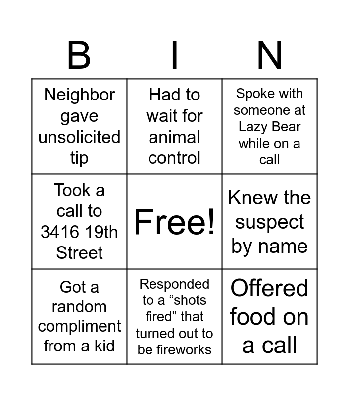 This bingo card has a free space and 8 words: Knew the suspect by name, Spoke with someone at Lazy Bear while on a call, Had to wait for animal control, Got a random compliment from a kid, Neighbor gave unsolicited tip, Offered food on a call, Took a call to 3416 19th Street and Responded to a “shots fired” that turned out to be fireworks.