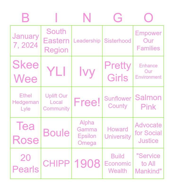This bingo card has a free space and 25 words: Boule, 1908, Ivy, 20 Pearls, Empower Our Families, January 7, 2024, Skee Wee, South Eastern Region, Sunflower County, Alpha Gamma Epsilon Omega, Pretty Girls, Ethel Hedgeman Lyle, Howard University, Advocate for Social Justice, YLI, AGEO, Salmon Pink, Leadership, Enhance Our Environment, Uplift Our Local Community, "Service to All Mankind", CHIPP, Tea Rose, Sisterhood and Build Economic Wealth.