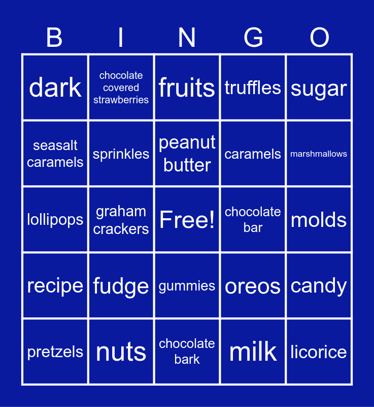 This bingo card has a free space and 29 words: grandfather, nuts, fruits, creams, sugar, dark, sprinkles, peanut butter, chocolate bar, candy, pretzels, graham crackers, milk, licorice, lollipops, white, chocolate bark, oreos, marshmallows, recipe, fudge, jelly beans, caramels, molds, seasalt caramels, chocolate covered strawberries, gummies, truffles and sweets.