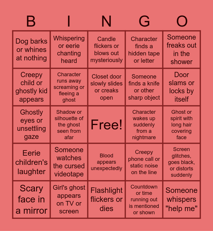 This bingo card has a free space and 24 words: Someone watches the cursed videotape, Girl's ghost appears on TV or screen, Closet door slowly slides or creaks open, Scary face in a mirror, Someone freaks out in the shower, Dog barks or whines at nothing, Creepy child or ghostly kid appears, Whispering or eerie chanting heard, Character wakes up suddenly from a nightmare, Blood appears unexpectedly, Someone finds a knife or other sharp object, Ghostly eyes or unsettling gaze, Creepy phone call or static noise on the line, Screen glitches, goes black, or distorts suddenly, Character runs away screaming or fleeing a ghost, Countdown or time running out is mentioned or shown, Ghost or spirit with long hair covering face, Candle flickers or blows out mysteriously, Door slams or locks by itself, Shadow or silhouette of the ghost seen from afar, Someone whispers "help me", Eerie children's laughter, Character finds a hidden tape or letter and Flashlight flickers or dies.