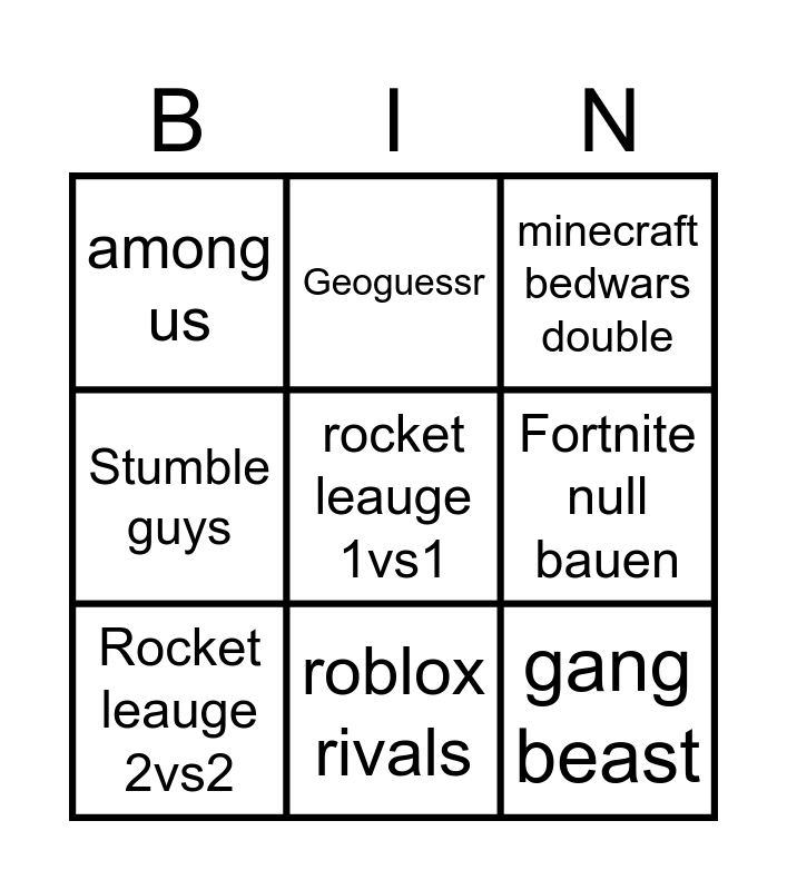 This bingo card has a free space and 8 words: Stumble guys, Geoguessr, Fortnite null bauen, Rocket leauge 2vs2, minecraft bedwars double, among us, roblox rivals and gang beast.