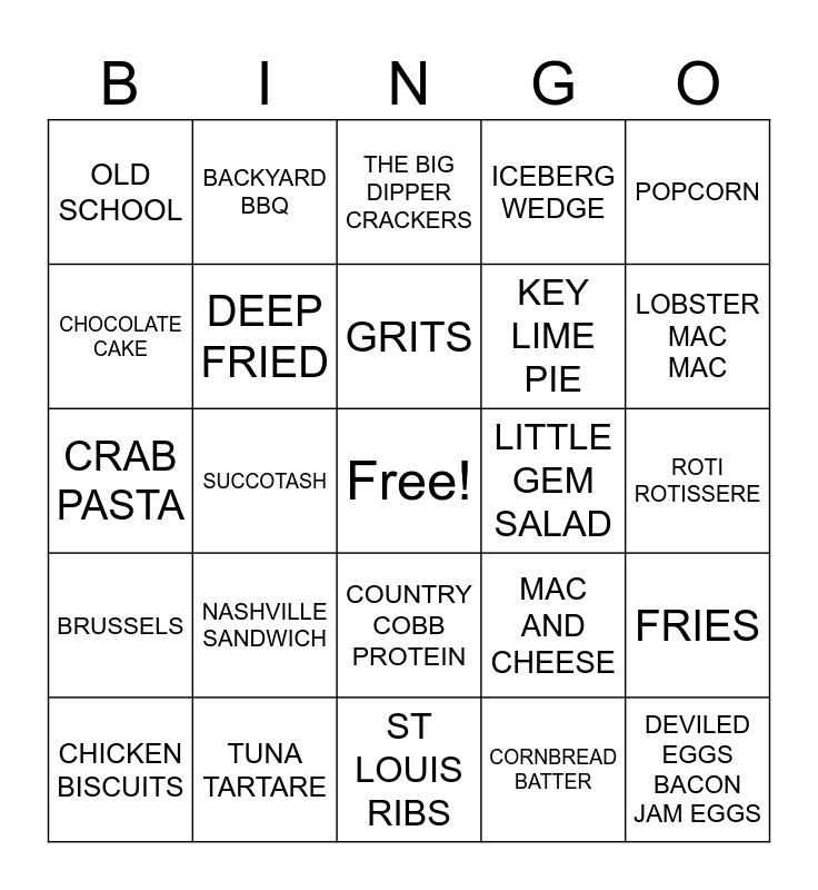 This bingo card has a free space and 45 words: GREEN TOMATO, DEVILED EGGS BACON JAM EGGS, DEVILED EGGS, CHICKEN BISCUITS, BUTTERMILK BISCUITS, CORNBREAD BATTER, THE BIG DIPPER CRACKERS, TEXAS TWINKIE, POPCORN, TUNA TARTARE, ICEBERG WEDGE, LITTLE GEM SALAD, COUNTRY COBB PROTEIN, NASHVILLE SANDWICH, WAYGU BURGER, ST LOUIS RIBS, BLACKENED SALMON *, CRAB PASTA, SHRIMP AND GRITS, LOBSTER MAC MAC, BACKYARD BBQ, BRISKET DIP BREAD, CAST IRON PETITE FILET, OLD SCHOOL, FRIED CHICKEN, ROTI ROTISSERE, TENDERS CHICKEN, NASHVILLE STYLE CHIX/, MAC AND CHEESE, BRUSSELS, STREET CORN, FRIES, FRIED OKRA, COLLARDS, MAMA’S MASH, SUCCOTASH, DIRTY RICE MAYO GAR/ON SAUSAGE CAYENNE, CHIMICHURRI, GREEN BEANS, GRITS, CHOCOLATE CAKE, KEY LIME PIE, APPLE COBBLER, DEEP FRIED and BANANA PUDDING.