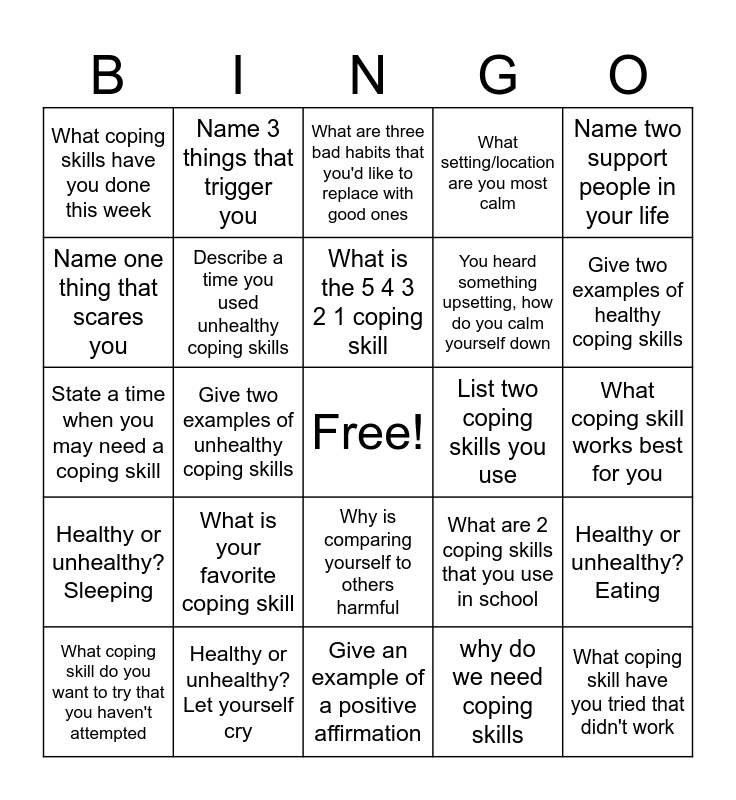 This bingo card has a free space and 29 words: What coping skill do you want to try that you haven't attempted, What is a "distraction" coping skill that works for you, Give two examples of unhealthy coping skills, What are grounding techniques, What coping skills have you done this week, What are three bad habits that you'd like to replace with good ones, Describe a time you used unhealthy coping skills, What is your favorite coping skill, List two coping skills you use, Healthy or unhealthy? Let yourself cry, What coping skill works best for you, What coping skill have you tried that didn't work, Give an example of a positive affirmation, why do we need coping skills, Give two examples of healthy coping skills, Healthy or unhealthy? Exercise, Why is comparing yourself to others harmful, Healthy or unhealthy? Sleeping, Name two support people in your life, State a time when you may need a coping skill, What are 2 coping skills that you use in school, What is one source of stress in your life, You heard something upsetting, how do you calm yourself down, Name one thing that scares you, What setting/location are you most calm, Name 3 things that trigger you, Healthy or unhealthy? Eating, What is the 5 4 3 2 1 coping skill and What coping skills have you used this week.