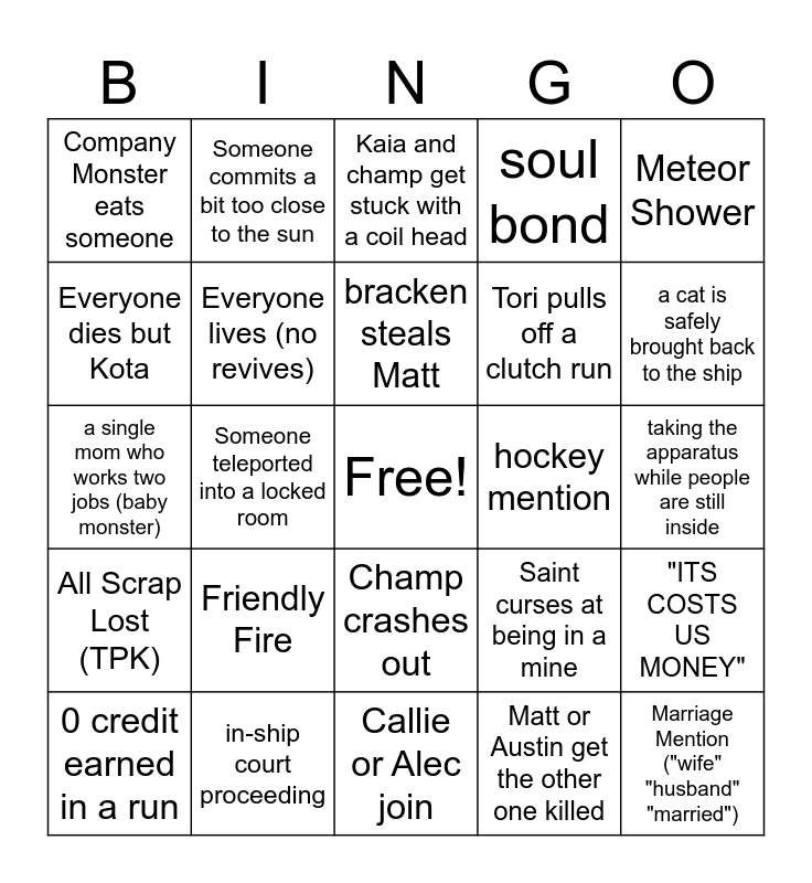 This bingo card has a free space and 48 words: Champ rolls dice and someone dies because of it, Marriage Mention ("wife" "husband" "married"), Saint kills a monster, Callie or Alec join, Friendly Fire, Fire exits are right next to each other, Someone commits a bit too close to the sun, "all bad", Everyone dies but Kota, someone gets left behind, Everyone lives (no revives), soul bond, "ITS COSTS US MONEY", Saint curses at being in a mine, Someone runs into their own mimic, someone besides Champ rolls dice, bracken steals Matt, hockey mention, Dog gets inside the ship, Meteor Shower, Someone teleported into a locked room, Matt or Austin get the other one killed, Company Monster eats someone, Tori pulls off a clutch run, kota dies (no longer rare occurrence), a cat is safely brought back to the ship, 0 credit earned in a run, Apparatus brought back successfully, Champ crashes out, All Scrap Lost (TPK), 1000 credit run, Anvil brought back successfully, a single event/monster kills 3+ people, Bee Hives brought back successfully, in-ship court proceeding, teammate gets eaten by giant/siren head, partying in the ship not realizing everyone else is dead, taking the apparatus while people are still inside, JUMP IN THE PIT, dying within the first 2 minutes of landing, LADS mention, ACCIDENTAL ceiling trap death, Kaia and champ get stuck with a coil head, 3 or more snails at once, a single mom who works two jobs (baby monster), someone waits a long time for kota to TP them, roleplay MOMENT and saint escapes a horrible situation only to die before she gets to safety.