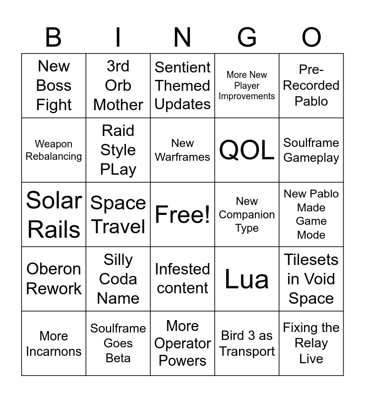 This bingo card has a free space and 33 words: We Go to Tau, Reb Cries, Space Travel, Railjack, Oberon Rework, Raid Style PLay, Pre-Recorded Pablo, More Incarnons, 3rd Orb Mother, Man in the Wall, New Warframes, Sentient Themed Updates, New Skins, Soulframe Animals, New Companion Type, Soulframe Gameplay, Soulframe Goes Beta, Solar Rails, Silly Coda Name, Lua, Infested content, Awesome Music, New Boss Fight, New Pablo Made Game Mode, More Operator Powers, Fixing the Relay Live, More New Player Improvements, QOL, Weapon Rebalancing, Tilesets in Void Space, Steve is Old, Bird 3 as Transport and The Sergeant.