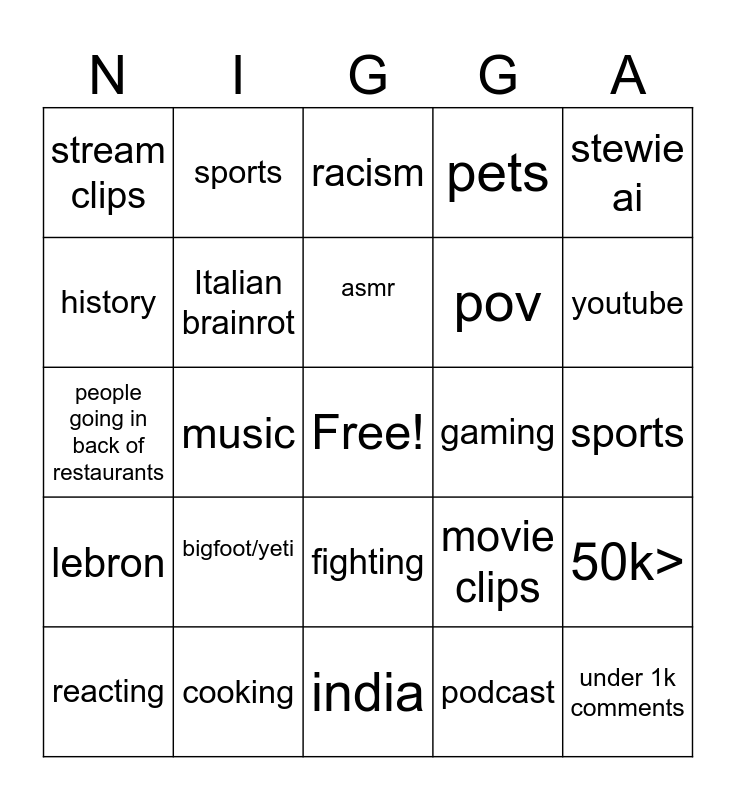 This bingo card has a free space and 24 words: bigfoot/yeti, cooking, asmr, reacting, stewie ai, stream clips, history, sports, gaming, fighting, pov, people going in back of restaurants, movie clips, 50k>, Italian brainrot, podcast, sports, racism, youtube, music, under 1k comments, lebron, pets and india.