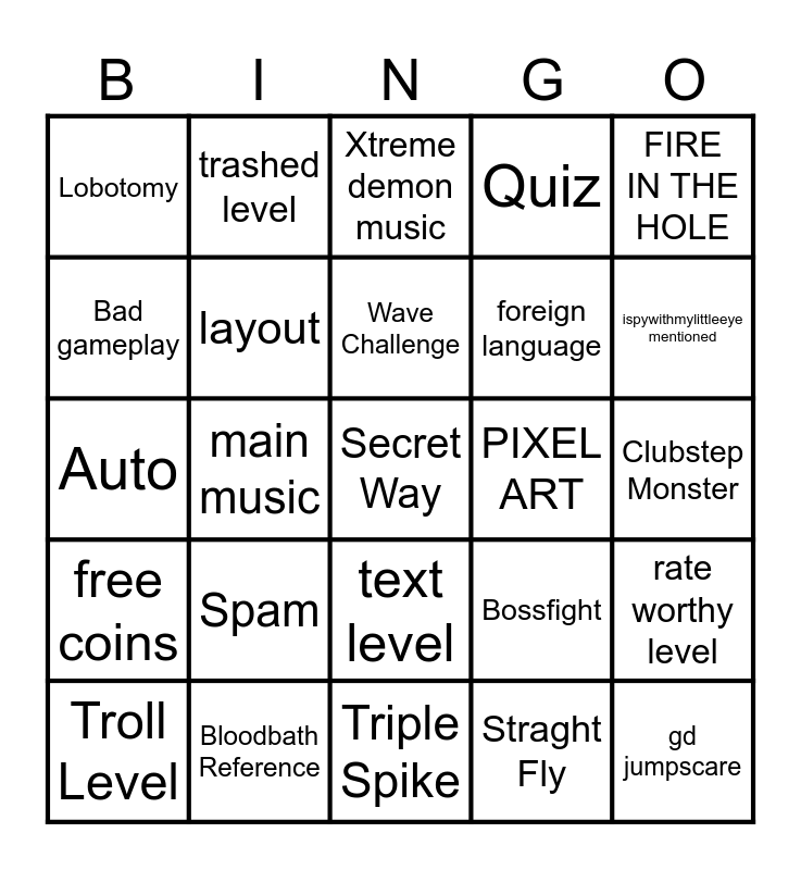 This bingo card has a free space and 24 words: Spam, Bloodbath Reference, Wave Challenge, Troll Level, FIRE IN THE HOLE, Lobotomy, Bad gameplay, trashed level, PIXEL ART, text level, foreign language, Auto, Bossfight, rate worthy level, layout, Straght Fly, Clubstep Monster, Xtreme demon music, ispywithmylittleeye mentioned, main music, gd jumpscare, free coins, Quiz and Triple Spike.