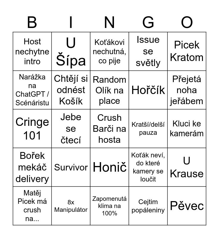This bingo card has 25 words: Survivor, Zapomenutá klima na 100%, Random Olík na place, Matěj Picek má crush na..., Picek Kratom, Host nechytne intro, Narážka na ChatGPT / Scénáristu, U Šípa, Kratší/delší pauza, Honič, Hořčík, Cringe 101, Koťák neví, do které kamery se loučit, U Krause, Chtějí si odnést Košík, Pěvec, Kluci ke kamerám, Koťákovi nechutná, co pije, Přejetá noha jeřábem, Jebe se čtecí, Crush Barči na hosta, 8x Manipulátor, Bořek mekáč delivery, Issue se světly and Cejtim popáleniny.
