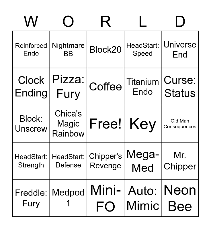 This bingo card has a free space and 64 words: Jack-O-Bonnie, Jack-O-Chica, Nightmarionne, Mr. Chipper, Animdude (Character), Animdude (Boss), Nightmare BB, PurpleGuy, Coffee, Security Owl, Chipper's Revenge, Pearl Byte, Old Man Consequences, Universe End, Get A Clock, Clock Ending, Chica's Magic Rainbow, Reinforced Endo, Steel Endo, Titanium Endo, HeadStart: Defense, HeadStart: Strength, HeadStart: Speed, Evercomet: Weak, QuickStart: Party, Block: Jumpscare, Run: Luck, Endless: Defense, Endless: Strength, Endless: Speed, Evercomet: Strong, Auto: Giftboxes, Auto: Regen, Find: Characters, Curse: Status, Freddle: Fury, Auto: Shield, Auto: Mimic, Counter: Bite, Pizza: Fury, Block: Unscrew, Key, Gold Endo (Boss), Gnat, Neon Wasp, Neon Bee, Medpod 1, Medpod 2, Mega-Med, Mini-Reaper, Reaper, X-Reaper, Mini-FO, UFO, X-FO, Block5, Block20, Block50, Pop-Pop, BOOM!, KABOOM!, BossDrain-01, BossDrain-02 and BossDrain-X.