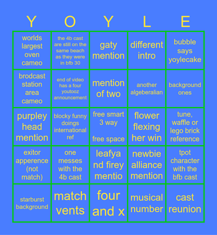 This bingo card has a free space and 25 words: one messes with the 4b cast, four and x, mention of two, starburst background, bubble says yoylecake, worlds largest oven cameo, brodcast station area cameo, the 4b cast are still on the same beach as they were in bfb 30, flower flexing her win, leafya nd firey mentio, another algeberalian, purpley head mention, newbie alliance mention, tpot character with the bfb cast, end of video has a four youtooz announcement, match and pencil plush anouncement, tune, waffle or lego brick reference, gaty mention, background ones, blocky funny doings international ref, cast reunion, match vents, exitor apperence (not match), different intro and musical number.