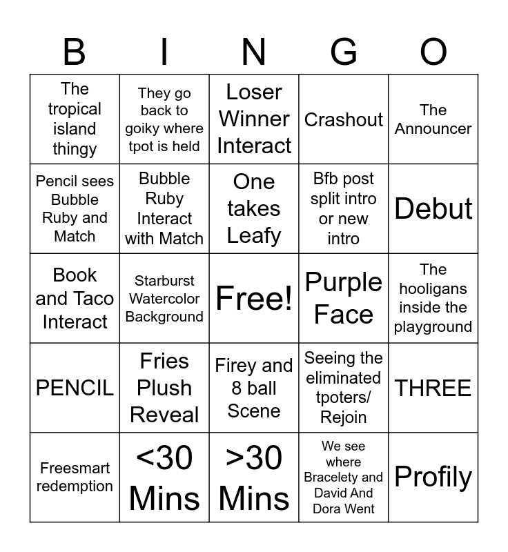 This bingo card has a free space and 24 words: Freesmart redemption, Fries Plush Reveal, One takes Leafy, We see where Bracelety and David And Dora Went, The Announcer, The tropical island thingy, They go back to goiky where tpot is held, Loser Winner Interact, Purple Face, The hooligans inside the playground, Book and Taco Interact, Bubble Ruby Interact with Match, Seeing the eliminated tpoters/ Rejoin, THREE, Pencil sees Bubble Ruby and Match, <30 Mins, >30 Mins, Crashout, Debut, PENCIL, Starburst Watercolor Background, Firey and 8 ball Scene, Bfb post split intro or new intro and Profily.