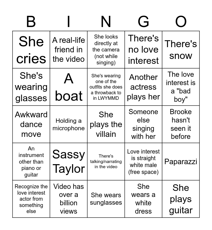 This bingo card has 25 words: Sassy Taylor, She wears sunglasses, She's wearing one of the outfits she does a throwback to in LWYMMD, Recognize the love interest actor from something else, There's snow, She cries, She's wearing glasses, A real-life friend in the video, Someone else singing with her, There's talking/narrating in the video, Another actress plays her, Awkward dance move, Love interest is straight white male (free space), Paparazzi, A boat, She plays guitar, Brooke hasn't seen it before, She looks directly at the camera (not while singing), The love interest is a "bad boy", Holding a microphone, She plays the villain, Video has over a billion views, An instrument other than piano or guitar, There's no love interest and She wears a white dress.
