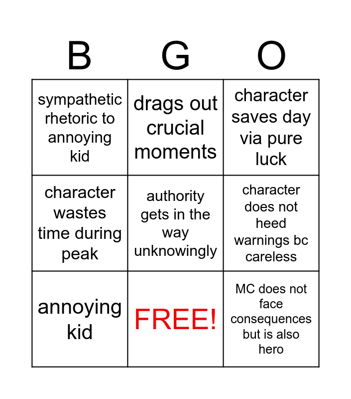This bingo card has a free space and 8 words: character does not heed warnings bc careless, character saves day via pure luck, drags out crucial moments, annoying kid, sympathetic rhetoric to annoying kid, MC does not face consequences but is also hero, character wastes time during peak and FREE!.