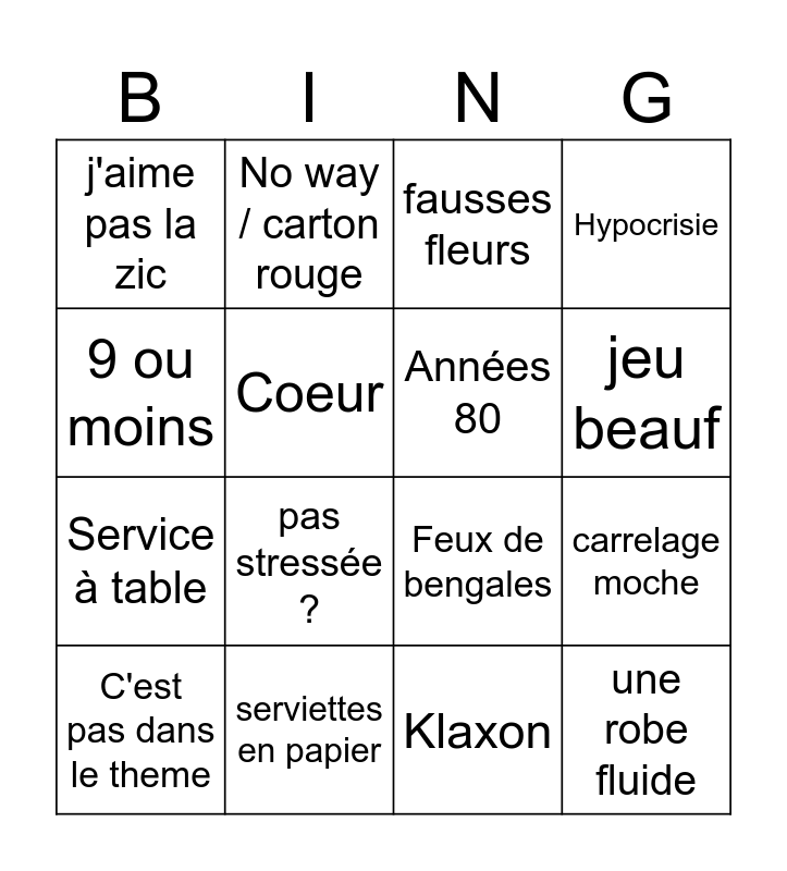 This bingo card has 16 words: serviettes en papier, carrelage moche, fausses fleurs, j'aime pas la zic, Service à table, No way / carton rouge, Feux de bengales, Klaxon, 9 ou moins, Coeur, C'est pas dans le theme, Hypocrisie, pas stressée ?, jeu beauf, Années 80 and une robe fluide.