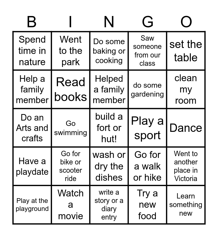 This bingo card has a free space and 29 words: Play at the playground, Play a board game, Go swimming, Go to the beach, Spend time in nature, Do some baking or cooking, Read books, Go for bike or scooter ride, Play a sport, Watch a movie, Dance, Learn something new, write a story or a diary entry, Try a new food, clean my room, Visit the library, wash or dry the dishes, Have a playdate, set the table, Do an Arts and crafts, Go for a walk or hike, colour in or do some drawing, do some gardening, Help a family member, Saw someone from our class, Went to the park, Went to another place in Victoria, Helped a family member and Went swimming.